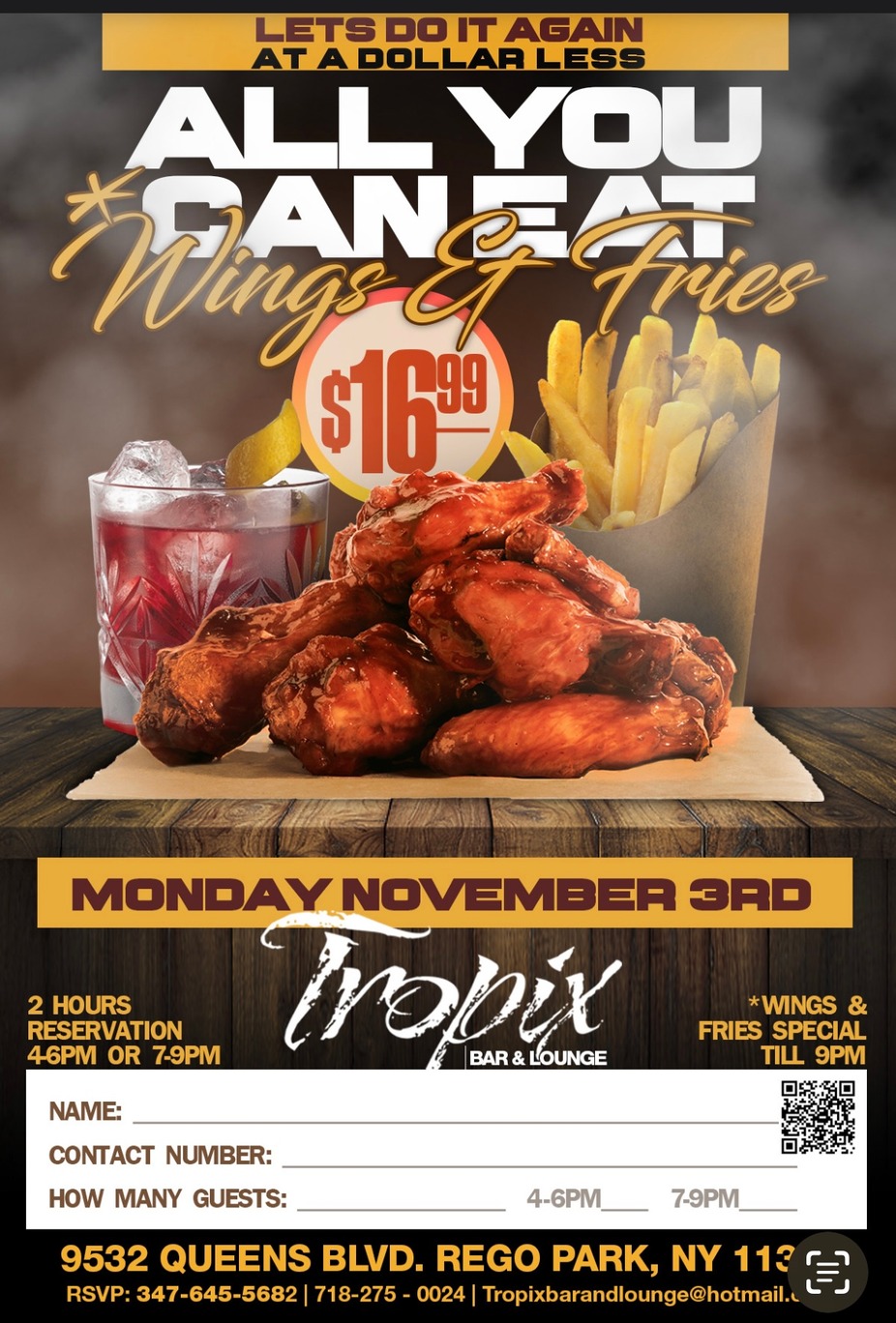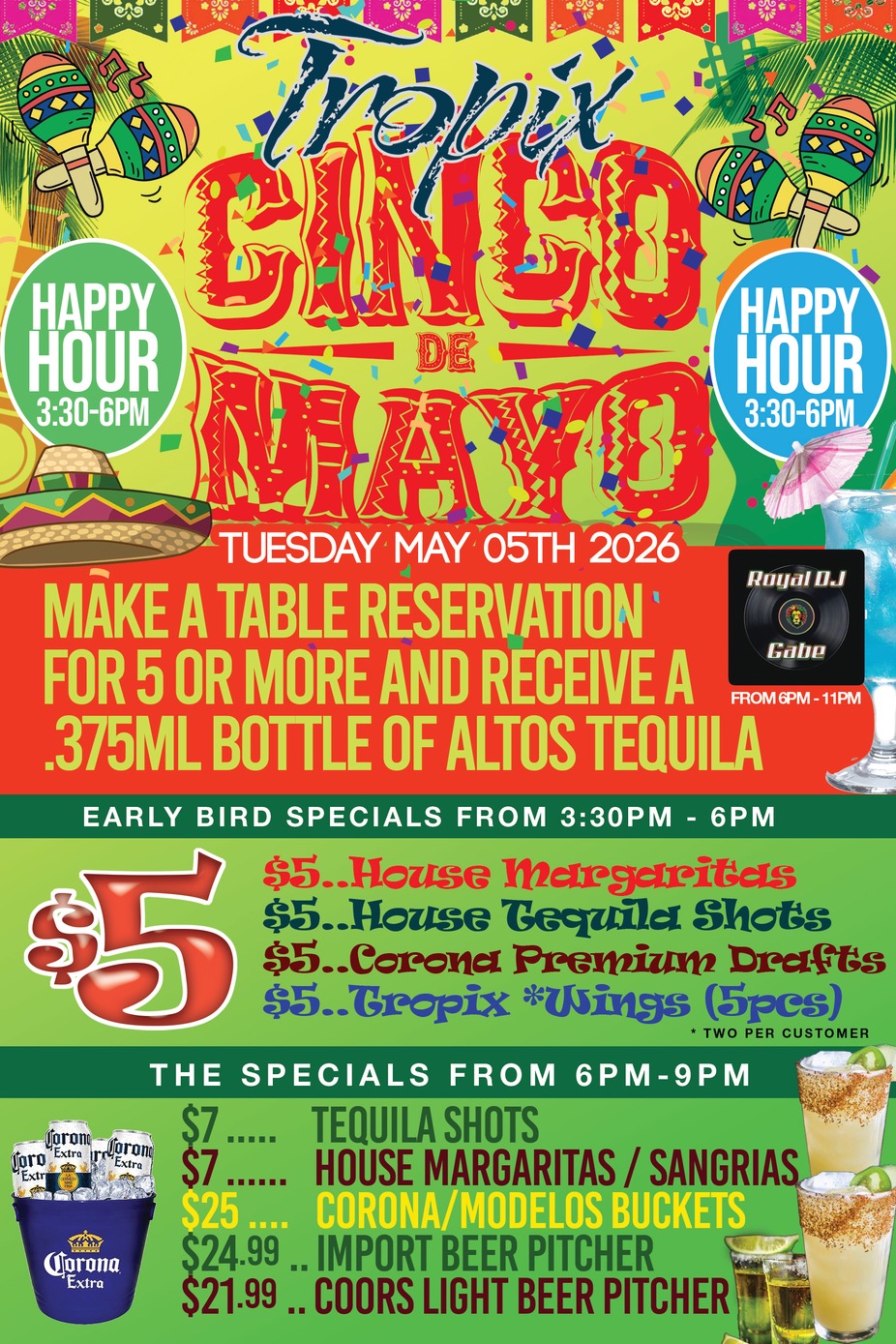 Tropix Bar & Lounge has been serving Rego Park since 2004. Our mission is to provide a place where you can let go and have a good time in a welcoming and friendly environment. We are a family-owned business that has many years of experience in the service industry. We have renovated and improved our services over the years and will continue to look for bigger and better things to make your Tropix experience the best it can be. Tropix has been recognized over the years for community service including contributions to victims from Super Storm Sandy and just recently our Wings to Warriors COVID initiative delivering our signature Tropix Wings to local Hospitals, EMS, and the 112 precinct. Our success over the years has been due to our mission statement from the very beginning: “Appreciate Your Customer.” With over 19 years of success, we look forward to adding you to our long history of happy customers.